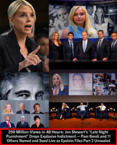 250 Million Views in 48 Hours: Jon Stewart’s “Late Night Punishment” Drops Explosive Indictment – Pam Bondi and 11 Others Named and Sued Live as Epstein Files Part 2 Unveiled