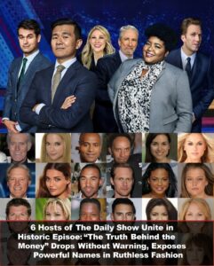 In an unprecedented and completely unannounced television event that has left viewers, media insiders, and the political world reeling, all six hosts of The Daily Show appeared together on screen for a special episode titled “The Truth Behind the Money.” There was no teaser, no promotional graphic, no social media hint—only the sudden shift of studio lights and the simultaneous appearance of the current and former hosts, standing shoulder to shoulder in a formation that instantly silenced the live audience.