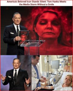 The silence stretched longer than anyone anticipated. Normally, the opening moments of such events carried a low buzz—shuffling papers, whispered side conversations, the occasional cough. Today the air felt heavier, almost thick. Reporters exchanged quick glances, eyebrows raised, pens hovering above notepads. Producers murmured into headsets, directing camera operators to tighten shots on the actor’s expressionless features. Yet Hanks offered nothing. He did not adjust his tie, shift his weight, or glance at prepared remarks. He simply stood, hands resting lightly on the podium edges, eyes fixed somewhere beyond the blinding lights.