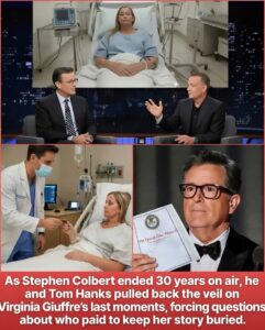 Stephen Colbert didn’t walk offstage with applause. He walked off with the last words Virginia Giuffre ever recorded. Tom Hanks stood beside him. Together they pulled back the veil—not to entertain, but to demand: Who paid to keep her story buried? And how much longer will the rest of us keep cashing the check?