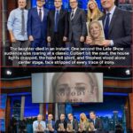 The laughter died in an instant. One second the Late Show audience was roaring at a classic Colbert bit; the next, the house lights dropped, the band fell silent, and Stephen stood alone center stage, face stripped of every trace of irony.T