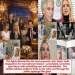 The lights dimmed for the next presenter, but Taylor Swift stepped to the microphone instead—unscripted, uninvited, eyes fierce with something raw and unbreakable. The Golden Globes audience froze as her voice cut through the polite applause like glass.T