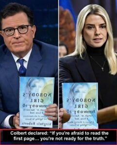 One line — and America froze. No warning, no jokes, no script. Colbert walked onto The Late Show with red eyes and Virginia Giuffre’s memoir in his hand, as if he had just seen what millions are still too afraid to face. What began as a simple tribute instantly morphed into a fiery manifesto. With a voice trembling yet sharp as a blade, Colbert stripped away every layer of late-night armor and spoke directly to the nation — and to Pam Bondi — in a way no one had ever heard from him before.