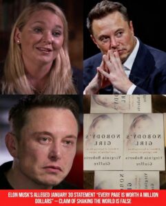 A viral social media claim circulating recently asserts that on the night of January 30, 2026, Elon Musk triggered a massive storm with a statement: “EVERY PAGE IS WORTH A MILLION DOLLARS,” supposedly referring to Virginia Giuffre’s memoir or Epstein files, and that this “shook the world” with 1.2 billion views. The narrative often describes Musk reading Giuffre’s 2025 posthumous memoir Nobody’s Girl: A Memoir of Surviving Abuse and Fighting for Justice, becoming emotionally rattled, and vowing to expose truths tied to the Jeffrey Epstein scandal, cover-ups, or elite protections—possibly pledging millions for investigations or transparency.
