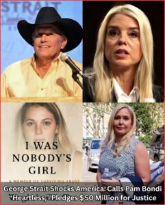 In a moment no one ever expected, the “King of Country Music,” George Strait, broke his decades-long public silence—not with a song, but with a direct, unflinching blow aimed at Attorney General Pam Bondi. During a surprise appearance at a Nashville charity event on January 7, 2026, Strait looked out over the crowd and said, with a calmness sharper than anger: “When you turn your back on a woman fighting for the truth, that isn’t professionalism—it’s cruelty. Pam Bondi, you weren’t just silent. You abandoned your conscience.