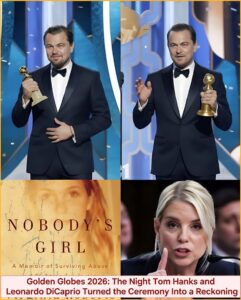 Tom Hanks held the book — Virginia Giuffre’s posthumous memoir Nobody’s Girl — with steady hands, while DiCaprio gripped it like living evidence. They did not continue reading. They didn’t need to. The single name, spoken aloud on one of the world’s biggest stages, was enough. The silence that followed was heavier than any accusation.