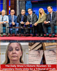 On the evening of January 8, 2026, The Daily Show opened not with laughter or satire, but with an unprecedented moment of gravity that silenced millions of viewers. Six of the program’s most iconic hosts—Jon Stewart, Trevor Noah, Craig Kilborn, Samantha Bee, Hasan Minhaj, and current host Jordan Klepper—walked onto the stage in deliberate procession. No desk banter. No opening monologue. Each carried a copy of Virginia Giuffre’s posthumous memoir, Nobody’s Girl: A Memoir of Surviving Abuse and Fighting for Justice.