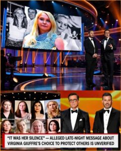 A viral post spreading across social media claims that two “kings of late-night television” (most frequently identified as Jon Stewart and Stephen Colbert, or sometimes Jimmy Kimmel) delivered a powerful, unified message on air: “It was her silence” that saved the lives of more than 30 other innocent girls. The narrative frames Virginia Giuffre’s long periods of silence — especially in the years following her initial encounters with Jeffrey Epstein — not as weakness or fear, but as a deliberate, strategic choice. According to the post, she understood that speaking too early could allow the truth to be buried forever under legal threats, media dismissal, elite influence, or institutional cover-up. Her restraint is portrayed as a protective act that preserved evidence, allowed other survivors to come forward safely, and ultimately helped expose the broader network.