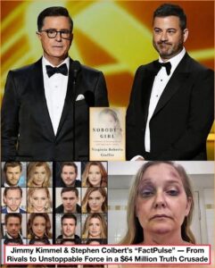Kimmel and Colbert met in a private room — no cameras, no microphones, just a thick folder on the table. They read every trembling line Giuffre had written. After hours of silence, they made the boldest decision of their careers: to invest $64 million of their own money to broadcast the truth in a way no corporation could control or suppress.
