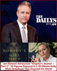No interruptions. No cuts. The razor-sharp revelations left viewers stunned, social media erupting with #VirginiasJournalPart2 and #DailyShowExposes trending globally. Reactions poured in: shock at the names, awe at Stewart’s unflinching delivery, and demands for real-world accountability amid stalled DOJ file releases under Attorney General Pam Bondi.