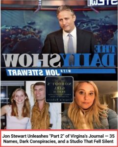 Inside were 35 names — influential, untouchable figures from Hollywood, politics, finance, and global elite circles — tied to a web of silence, power, and hidden conspiracies. Stewart read each one slowly, deliberately, without evasion or softening. Every page he turned made the studio feel less like a TV set and more like a courtroom. The audience sat in stunned stillness. No one laughed. No one moved. The silence was suffocating.