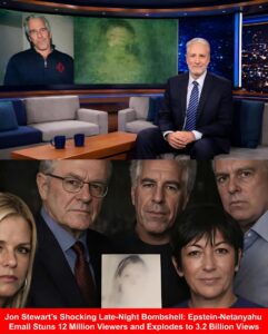 In one of the most explosive moments in recent late-night television history, Jon Stewart’s show drew more than 12 million viewers within the first hour of its live broadcast. What began as a regular episode quickly transformed into a global phenomenon when the production team made an unexpected revelation: they displayed an email allegedly sent by an unidentified source, with content reportedly linking Jeffrey Epstein and Benjamin Netanyahu.