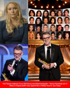 Director Paul Thomas Anderson, accepting his award, transformed what should have been a standard acceptance speech into a moment of unprecedented candor. Standing before a stunned audience, he directly called out Pam Bondi along with 15 other prominent figures allegedly connected to the case files of Virginia Giuffre — the woman long referred to as “the woman buried by power.”