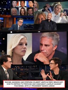 RACHEL MADDOW AND STEPHEN COLBERT UNITE IN FIERY BROADCAST: VOW TO DEFEND TV FREEDOM AND ANNOUNCE LAWSUIT AGAINST PAM BONDI, WITH 21 PROMINENT NAMES LINKED