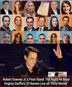 On January 16, 2026, Dirty Money didn’t end with a closing credits roll. It ended with Robert Downey Jr. reading 33 names aloud — names Virginia Giuffre had carried to her grave, names the world had spent decades pretending didn’t exist.