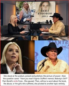 The legend speaks plainly: Pam Bondi, your silence makes you a coward and the shame of women in the face of Virginia Giuffre’s courage.