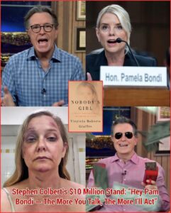 Colbert isn’t just defending Virginia—he’s proving her suffering cannot be erased. Bondi’s words backfired: the more she spoke, the louder truth became. With $10 million on the line, Colbert ensures Giuffre’s legacy endures—not as rumor, but reckoning.