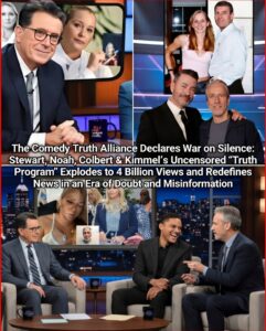 In a seismic shift that has captivated billions, Jon Stewart, Trevor Noah, Stephen Colbert, and Jimmy Kimmel — four satirical giants who once defined late-night rivalry — have united to launch the “Truth Program,” an uncensored, independent news platform that has already surpassed 4 billion views worldwide since its dramatic reveal.