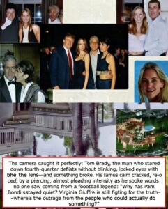 “Why has Pam Bondi stayed quiet?” Brady asked, voice low but carrying the same edge he once used to call audibles at the line of scrimmage. “Virginia Giuffre is still fighting for the truth—where’s the outrage from the people who could actually do something?”