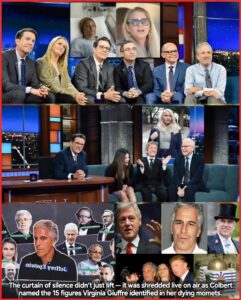 The camera never cut away. Colbert’s face remained calm, almost clerical. Behind him, the screen stayed black—no graphics, no chyrons, no crawl. When he finished, he looked directly into the lens and said: “These are the names she gave. Not speculation. Not rumor. Her final testimony. The rest is now on the public record.”