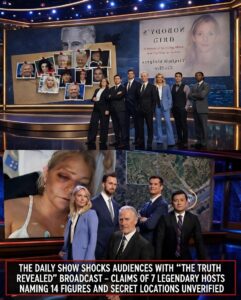 In the past 24 hours, viral posts across social media have claimed that The Daily Show aired a special episode titled “The Truth Revealed” last night, featuring seven legendary late-night hosts led by Jon Stewart. According to these accounts, the broadcast abandoned the show’s usual satirical format and instead presented a grave, collective reveal: 14 prominent figures allegedly responsible for crimes in the Jeffrey Epstein case, along with “secret locations” tied to the scandal. The episode is described as explosive, with no jokes, no desk banter, and no commercial interruptions—only a unified presentation of names, documents, timelines, and purported hidden sites that had supposedly been concealed for years.