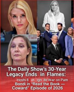 On the first episode of 2026, Jon Stewart walked onto the stage alone, the familiar set stripped bare, the laughter track silenced. Behind him, eight of the show’s most powerful hosts — Trevor Noah, Stephen Colbert, Jimmy Kimmel, John Oliver, Samantha Bee, Roy Wood Jr., Desi Lydic, and Jordan Klepper — rose simultaneously, silent, like jurors reading an indictment.