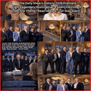 Then, without a word, seven more figures stepped from the shadows and took their places behind him: Craig Kilborn, Trevor Noah, Stephen Colbert, John Oliver, Samantha Bee, Hasan Minhaj, and Jordan Klepper. Eight hosts. Three decades of the show’s history. They stood shoulder to shoulder, arms at their sides, eyes fixed forward, wordless, unmoving, like prosecutors who no longer needed to speak because the evidence was already on the table.