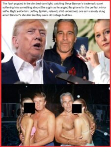 Bannon, shirtless in several shots, arm around Epstein in others, flashes the same half-smirk that once defined his media persona. Epstein, dressed casually, mirrors the pose with practiced ease. The selfies—grainy, poorly lit, unmistakably intimate—capture moments that feel almost domestic: two men who, on paper, should have occupied opposite poles of American power, laughing at their own reflections.
