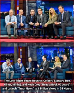 The studio lights flared as Stephen Colbert stepped center stage, flanked by Jon Stewart, Samantha Bee, John Oliver, Hasan Minhaj, and Trevor Noah—six voices that once defined sharp, fearless satire. In perfect sync, they looked straight into the camera and delivered the line that stopped the internet cold: