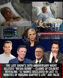 A viral post spreading rapidly claims that during The Late Show with Stephen Colbert‘s 26th anniversary special, Stephen Colbert—joined by veteran journalists—shattered every boundary of American media by publicly revealing, for the first time, a dramatic moment: “she disclosed 32 names in the last 15 minutes of her life.” The narrative describes a live “media bomb” that tore through conventional late-night television, presenting this as a previously unknown disclosure from Virginia Giuffre in her final moments before her suicide in April 2025.