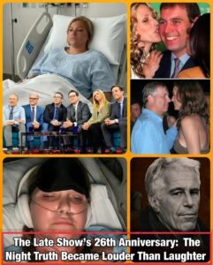 Colbert transformed the anniversary episode into a seismic event by publicly revealing — for the first time on television — the final 15 minutes of Virginia Giuffre’s life. In preserved hospital recordings from April 2025, her voice — frail yet resolute — disclosed 32 names linked to a secretive circle of power: individuals the public once thought untouchable.