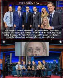 January 28, 2026. The Late Show set looked the same: blue-lit backdrop, desk, guest chair. Stephen Colbert walked out to the familiar applause, but the band did not play him in. The audience sensed it immediately. No monologue jokes. No topical zingers. He sat at the desk, folded his hands, and spoke in a voice most viewers had never heard from him before—quiet, unbroken, grave.