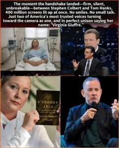 In an instant that redefined television’s power to confront the untouchable, Stephen Colbert and Tom Hanks met center stage, shook hands firmly, and declared Virginia Giuffre the opening voice of their unprecedented no-limits assault on entrenched power. The handshake—simple, deliberate, captured in tight close-up—ignited the broadcast. Within seconds of the moment airing, 400 million views erupted across every platform, shattering streaming and social records as the clip ricocheted globally.