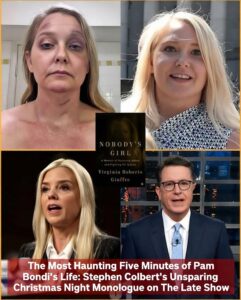 On Christmas night 2025, at the stroke of 11 p.m., Stephen Colbert delivered what viewers are calling the five most haunting minutes in late-night television history during a special segment titled Nightmare of the Powerful. With no opening jokes, no band fanfare, and no ironic detachment, Colbert stepped onto a dimly lit stage and turned his monologue into a direct, unflinching confrontation with the stalled Epstein files—and, by extension, Attorney General Pam Bondi.