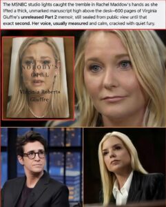 The MSNBC segment was already charged. Rachel Maddow had been dissecting the latest round of sealed-document releases tied to Jeffrey Epstein’s network when her producer slid a plain cardboard box across the desk during a commercial break. Inside: a thick, unmarked manuscript labeled only “Virginia Giuffre – Part 2 – Final Draft.” Giuffre’s estate had quietly delivered it that afternoon with instructions to air its existence if the moment felt right. Maddow opened the box on live television, lifted the 600-page stack, and held it toward the camera like evidence in a courtroom.