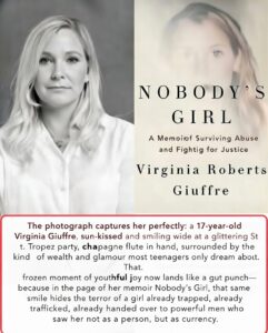 Giuffre’s death in April 2025 robbed her of the chance to see the book’s impact, but the photograph endures as her final, silent accusation. What was once a trophy of access and glamour has become, through her words, the coldest proof of betrayal. In Nobody’s Girl, that teenage smile no longer belongs to the party—it belongs to history, and to justice still being fought for.