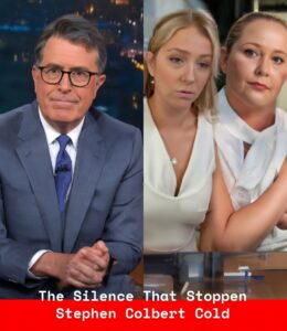 The audience waited. Phones stayed in laps; no one filmed. In an age when every second is content, the collective decision to simply witness felt almost reverent. Colbert’s hands, usually animated, rested flat against the desk as though bracing himself. His shoulders, normally loose and theatrical, locked into a rigid line.