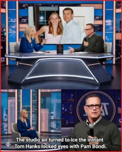 The CBS special “Truth and Accountability: The Epstein Legacy” was already tense when Pam Bondi, appearing as a legal commentator, began her familiar defense of institutional restraint. She argued that further disclosures from Virginia Giuffre’s posthumous memoir and sealed files risked “unsubstantiated chaos” and that “prudent silence” had protected the justice system for years. The panel nodded politely—until Tom Hanks, seated quietly at the far end of the table, leaned forward.