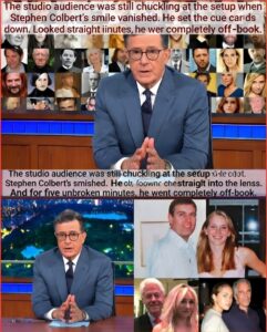 Colbert continued, naming no names, reading no documents, but laying out the architecture of protection: the lawyers who draft the gag orders, the executives who sign the checks, the friends who look away. “We in this business,” he said, “have been complicit. We’ve taken the easy joke instead of the hard truth. Tonight I’m not asking for applause. I’m asking for five minutes of your attention while I tell you what we’ve all known and pretended not to.”