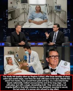 On the night of January 14, 2026, Stephen Colbert closed the chapter on three decades in late-night television not with jokes, not with a farewell montage, but with a revelation so seismic it silenced millions. In a special live broadcast on the Unfiltered Truth Network—co-hosted by Tom Hanks—the man who once defined sharp, irreverent commentary delivered his final act: the unedited audio of Virginia Giuffre’s last thirty minutes of life.