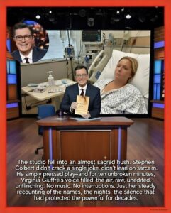 For the next ten minutes, the screen filled with Virginia Giuffre’s unedited testimony—delivered in a single, unbroken take from a recent, private recording. No graphics. No captions. No interruptions. Just Giuffre, looking straight ahead, recounting the precise sequence of events that pulled her into Jeffrey Epstein’s orbit, the names she says were present, the threats she endured, and the institutions she claims failed her at every turn. The footage had never been broadcast in its entirety before. Colbert let it breathe.