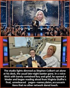 When no other network would risk the backlash, Stephen Colbert did what few dared: he gave Virginia Giuffre’s final, unfiltered words a national platform. In a raw, joke-free monologue on The Late Show, he read from what sources described as her dying testament—pages containing explosive allegations and names long shielded by power and privilege. That single broadcast not only amplified her voice but secured Colbert’s place on TIME’s 100 Most Influential People list.