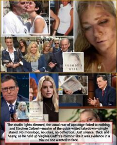 Giuffre’s voice, preserved in her book and now echoed on late-night television, serves as that warning: silence protects no one but the guilty. For Colbert, the shift from laughs to stillness marked a rare pivot—acknowledging that some truths demand gravity over gags. America watched, not laughing, but listening. And in that silence, the powerful felt the ground shift.
