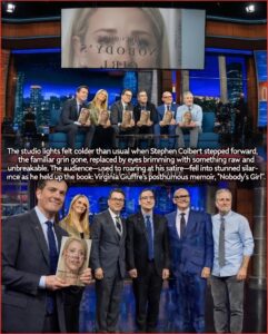The audience, usually primed for applause, sat in stunned quiet. Cameras captured faces frozen in discomfort and recognition. Colbert addressed the camera directly: “This book was meant to be buried. NDAs, legal maneuvers, media smears—everything power could throw at it. But Virginia outlasted them. Her words didn’t.”