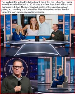 January 25, 2026. The 60 Minutes set, usually a place of measured journalism, turned into something far more confrontational. Correspondent Scott Pelley had invited Attorney General Pam Bondi for what was billed as a wide-ranging discussion on justice reform and the status of lingering Epstein-related investigations. What no one anticipated—least of all Bondi—was the surprise guest appearance of Tom Hanks.