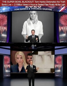 Within minutes, the clip surged to 2.5 billion views worldwide. Platforms buckled under the load. Social media timelines filled with stunned reactions rather than halftime memes. Hashtags #SuperBowlBlackout, #HanksTruthBomb, and #GiuffreTruth trended globally at record speed. Viewers posted raw responses: “He didn’t accuse — he exposed,” “If Tom Hanks won’t stay silent during the Super Bowl, how can we?” “This is the moment the light finally reached the shadows.”