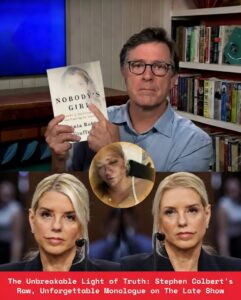 Colbert’s delivery carried the weight of long-suppressed realities finally breaking through. He addressed systemic issues of power, secrecy, and accountability with unflinching clarity, refusing to soften the edges for comfort or entertainment. Every sentence felt carefully chosen, stripped of embellishment, and aimed directly at the heart of the matter. The absence of jokes or ironic detachment only amplified the gravity, turning the monologue into something closer to a moral declaration than television banter.