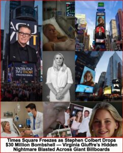 Times Square Freezes as Stephen Colbert Drops $30 Million Bombshell — Virginia Giuffre’s Hidden Nightmare Blasted Across Giant Billboards