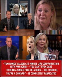 TOM HANKS’ ALLEGED 35-MINUTE LIVE CONFRONTATION WITH PAM BONDI – “YOU CAN’T EVEN DARE TO READ A SINGLE PAGE OF A BOOK — THE TRUTH IS, YOU’RE A COWARD” – IS COMPLETELY FABRICATED