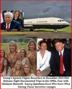 In the mid-1990s, the low rumble of a private jet climbing into the night sky carried more than just passengers—it carried secrets that would haunt American politics for decades. Newly released Department of Justice documents from December 2025 have reignited scrutiny over former President Donald Trump’s documented flights aboard Jeffrey Epstein’s infamous plane, revealing at least eight trips between 1993 and 1996, with Ghislaine Maxwell—Epstein’s closest confidante and later convicted sex trafficker—listed on at least four of them.